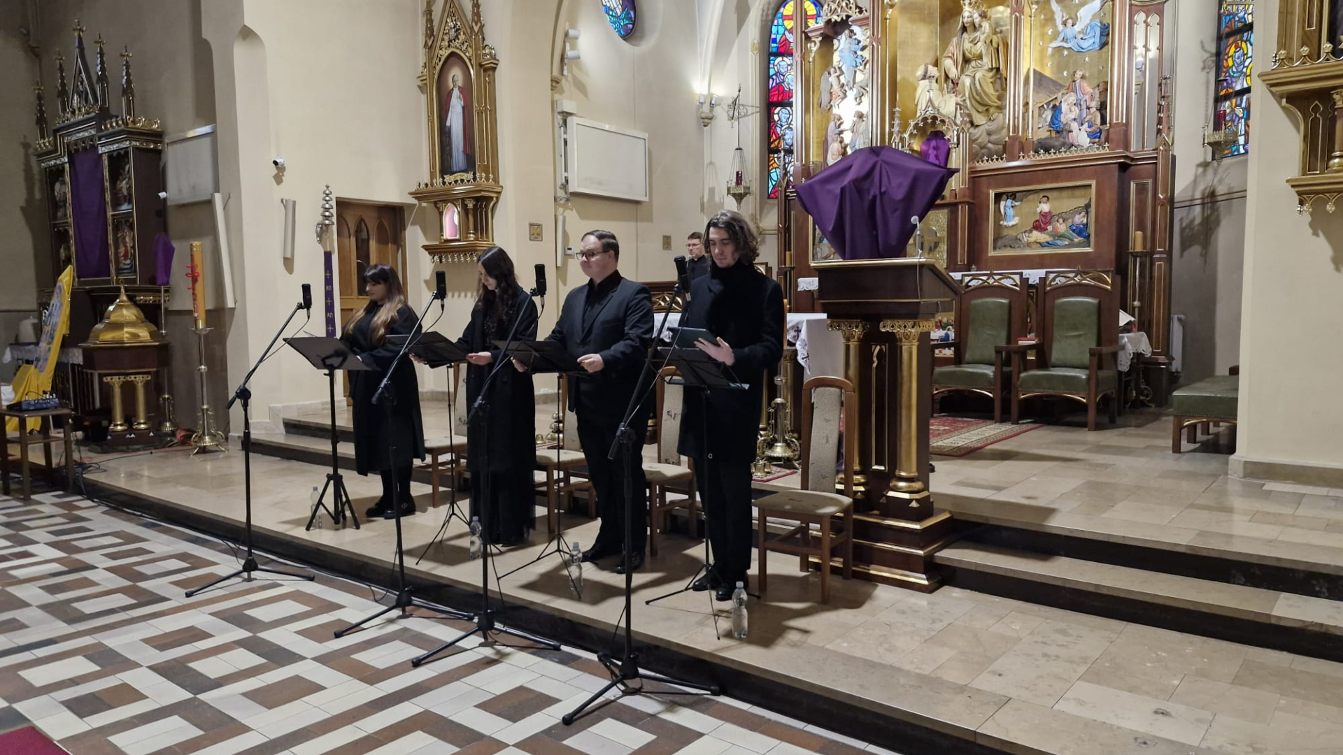W sobotnie popołudnie 28 marca w kościele miało miejsce wyjątkowe muzyczne spotkanie pasyjne. Gościliśmy kwartet wokalny - Aleksandrę Gawrych, Annę Ogierman, Jakuba Przyłuckiego i Benedykta Szostoka. Za organami zaś zasiadł Paweł Blaszczyk. Podczas koncertu artyści wykonywali pieśni pasyjne, angażując przy tym również uczestników. Rozważania zwracały uwagę na ostatnią scenę na Golgocie i siedem wypowiedzi Jezusa. Każde z tych słów, wypowiedziane w chwili największego bólu, niesie w sobie głębię. Są one nie tylko świadectwem cierpienia, ale przede wszystkim świadectwem miłości do końca.